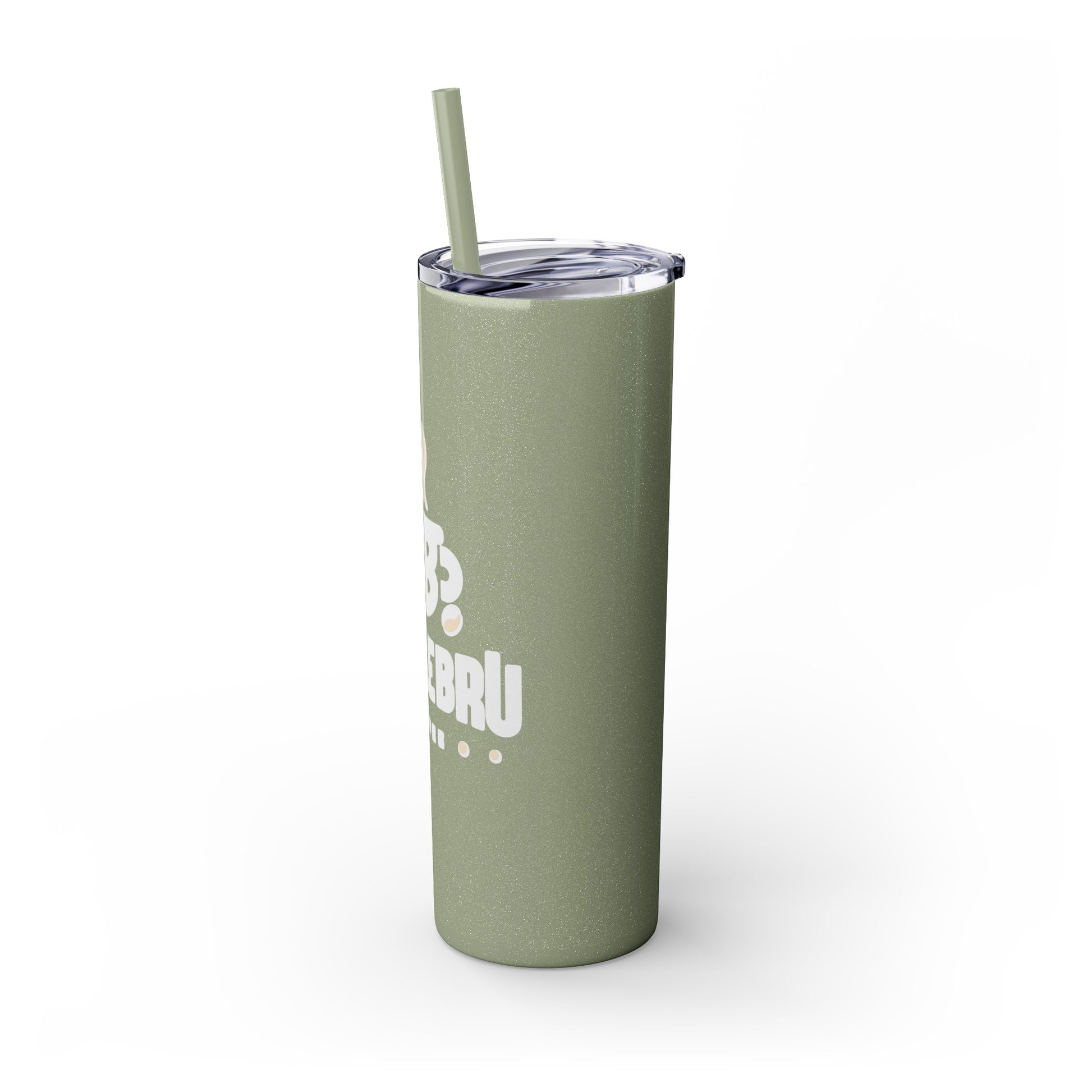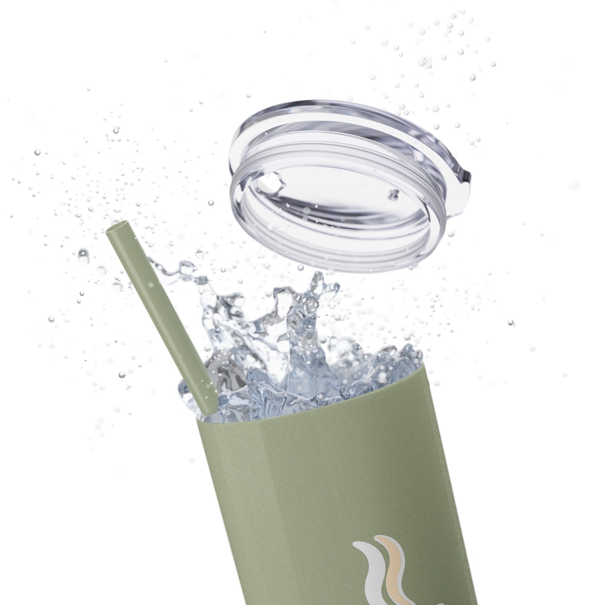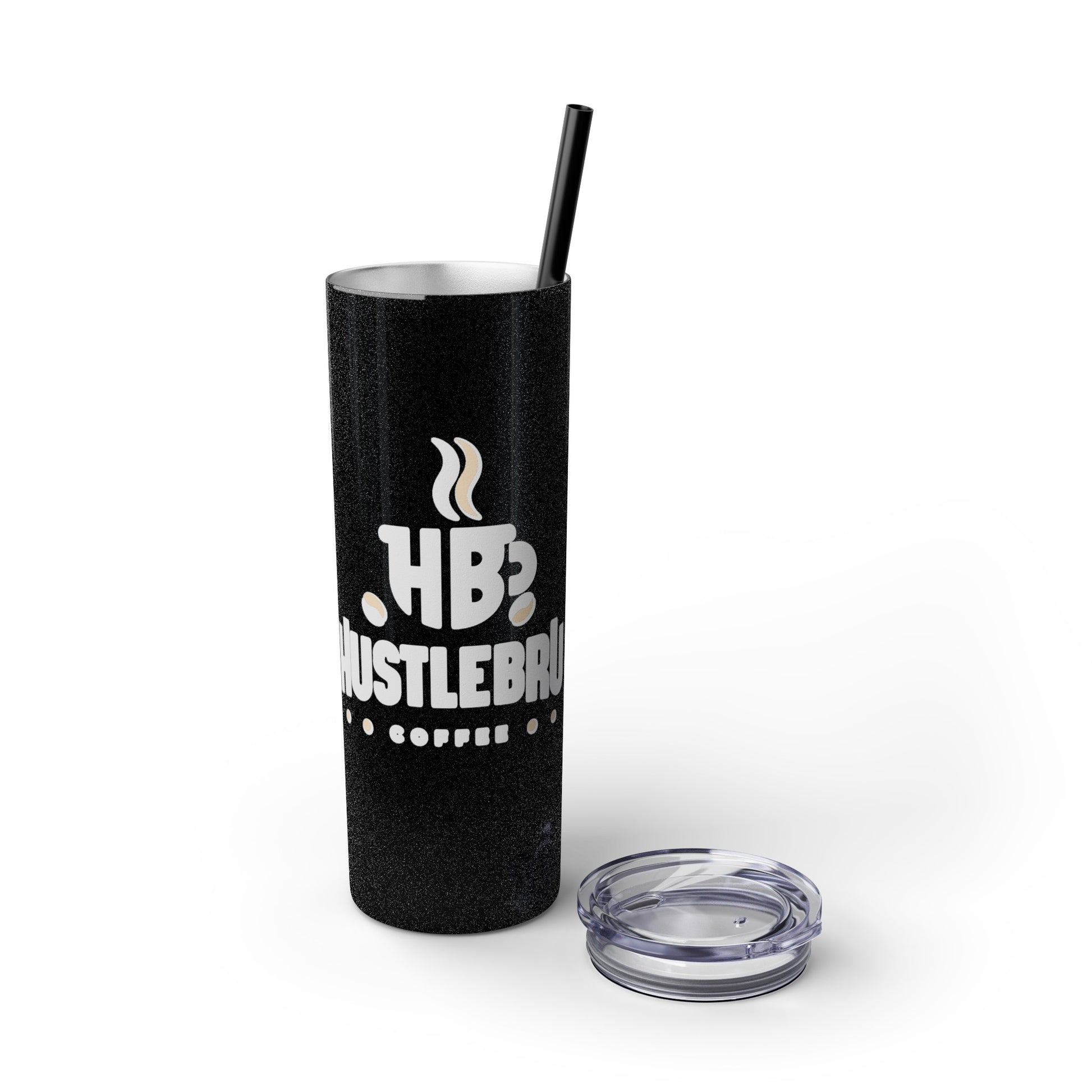 Check out the HustleBru Skinny Tumbler! It keeps your drinks hot for 12 hours and cold for 24 hours. It's 20oz, has a cool glittery finish, and a slim design for easy carrying. The lid comes with a matching straw for convenience on the go, and it's all BPA-free and non-toxic.